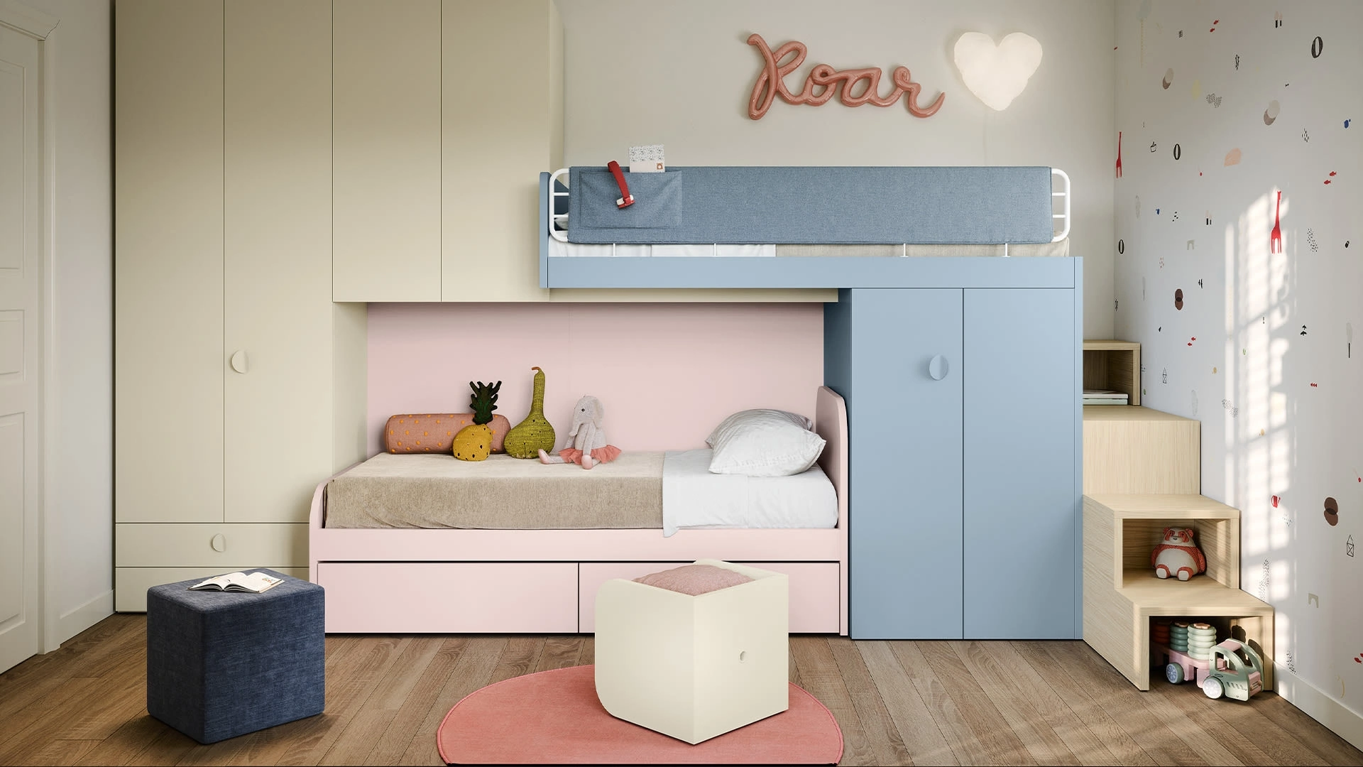 Con questa cameretta Soppalco Nidi, tra le soluzioni a soppalco, potrai arredare stanze moderne per bambine.