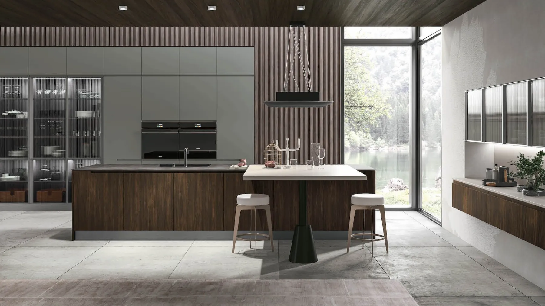 Il vano a giorno trova posto in più punti della cucina. Tra le colonne, apre gli spazi di contenimento e dà un tocco di colore. In testa al pensile, diventa un elemento esteticamente accattivante. Inoltre, l’anta copre la profondità del vano a giorno: quando è chiusa, lateralmente si nota solo il profilo colorato molto sottile, mentre frontalmente l’elemento non si vede.